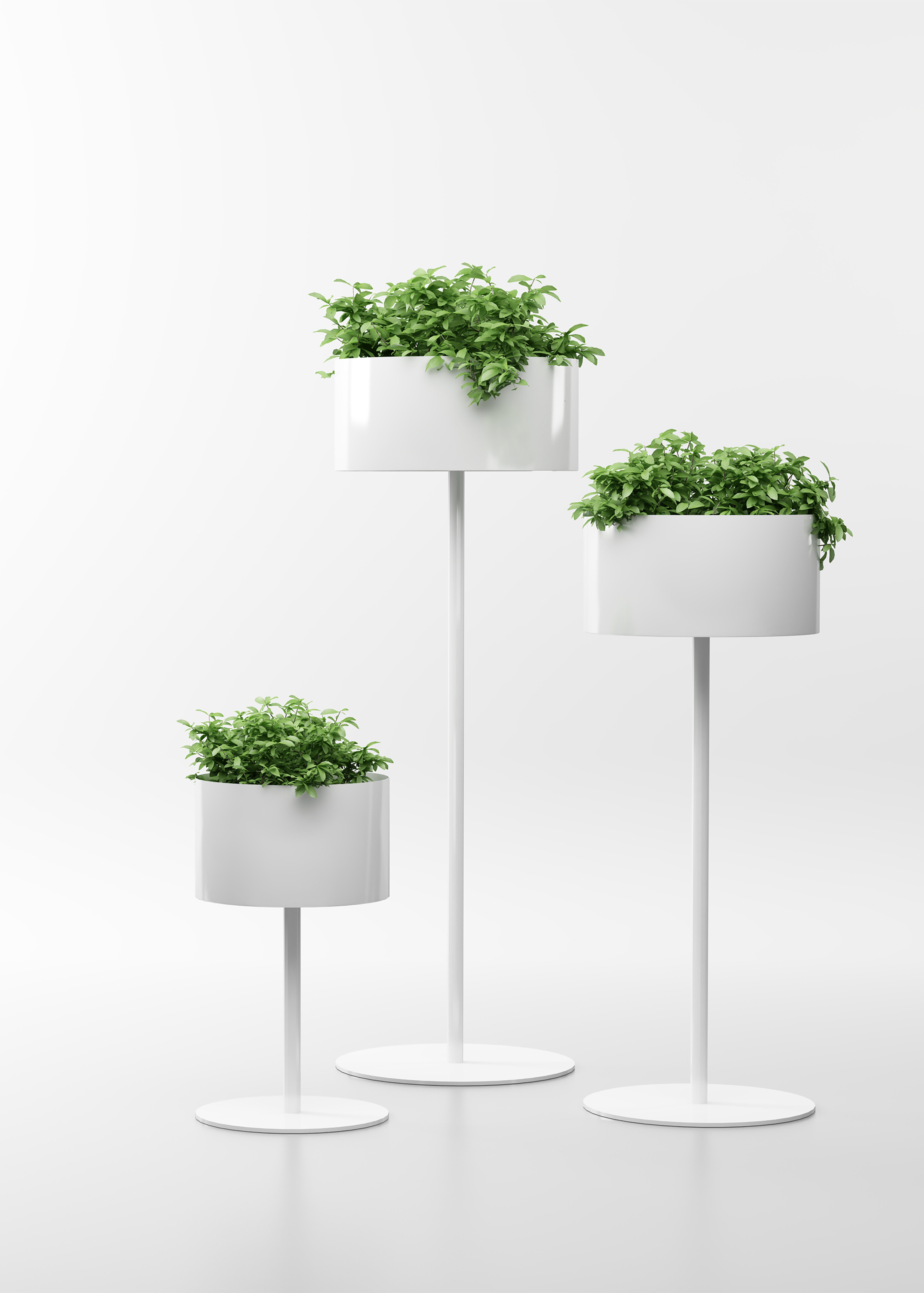 Working with the lamps structures, the plants are elevated from the floor, this fact give a new an innovative perspective to this kind of product. The main material is steel painted.
